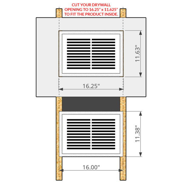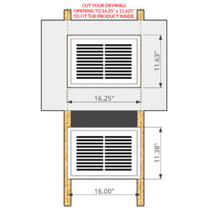 It muds right into your wall and finishes at 16″ x 11 3/8″ x 1/2″.