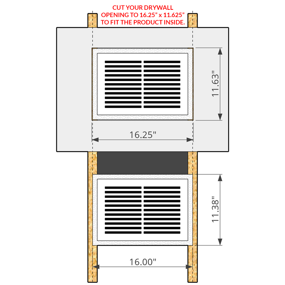 It muds right into your wall and finishes at 16″ x 11 3/8″ x 1/2″.