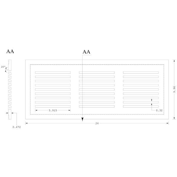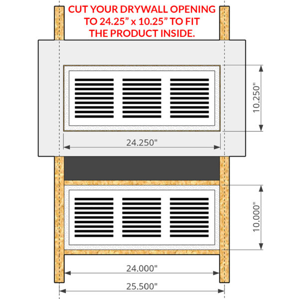 This Cold Air Return cover is a permanent fixture that was designed to replace the standard duct size opening of 24″ x 6″ or 24″ x 8″. It muds right into your wall, and finishes at 24″x 10″ with a slotted area of 20.5″ x 6″.