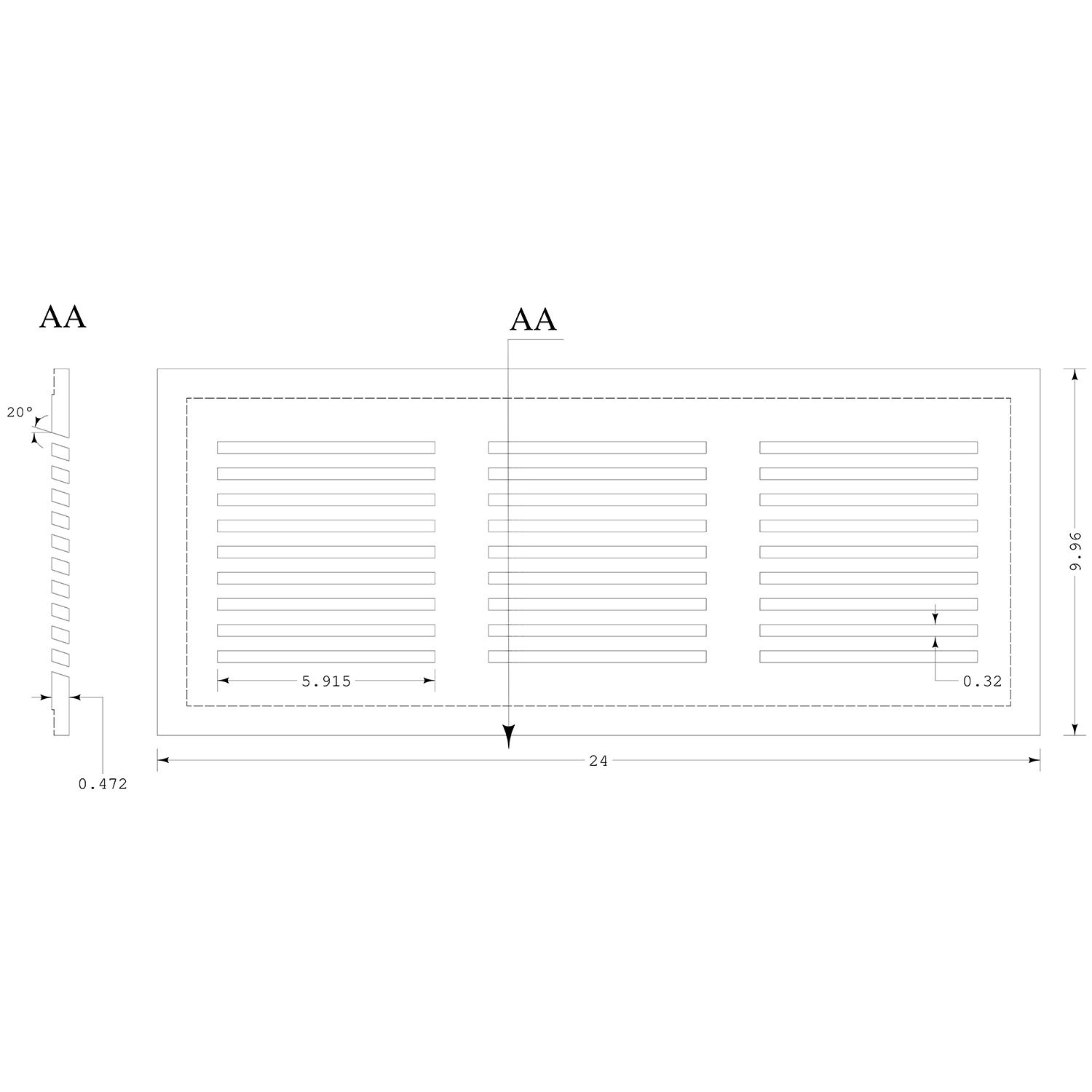 This Cold Air Return cover is a permanent fixture that was designed to replace the standard duct size opening of 24″ x 6″ or 24″ x 8″. It muds right into your wall, and finishes at 24″x 10″ with a slotted area of 20.5″ x 6″.