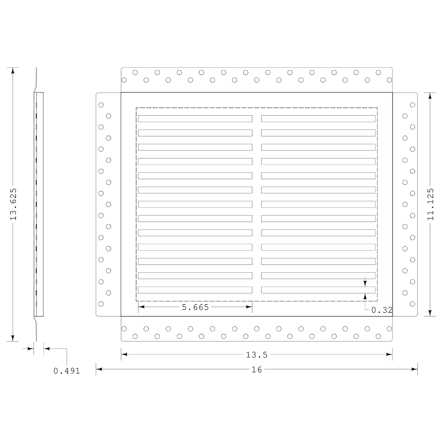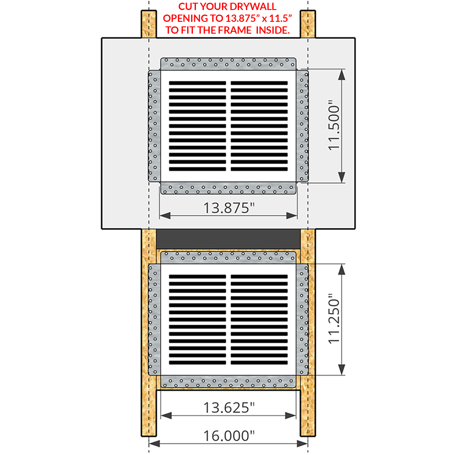 This Cold Air Return cover is magnetic and removable. It was designed to replace the standard duct size opening of 14″ x 8″. The frame muds right into your wall with a finished size of 16″ x 13 5/8″ x 1/2″. It fits into a drywall opening of 13 3/4″ x 11 1/2″ and has a slotted area of 12″ x 8 3/4″.