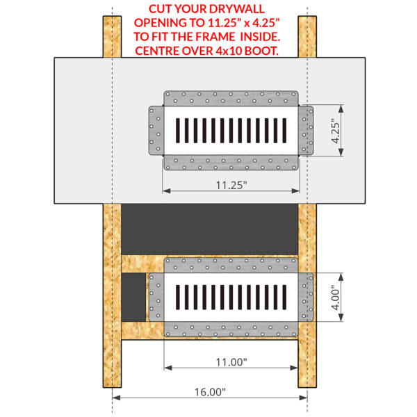 – Designed for 1/2″ or 5/8″ thick drywall, for a removable supply vent cover.